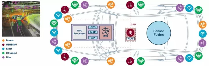 (图6)全自动驾驶车辆主要依赖360˚检测,需要使用先进的雷达、激光雷达、摄像头、惯性测量单元和超声波传感器