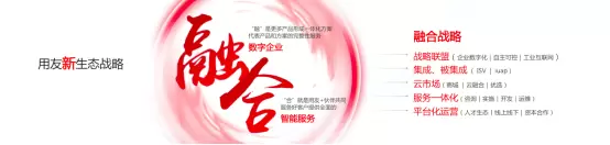 会上,用友发布新生态战略“融合”:融,代表“墙”的消融,用友和伙伴的产品方案融为一体,形成完整的企业数字化解决方案;合,代表用友和伙伴共同服务好客户,为企业提供全面的智能服务。“融合”战略五大策略方向,分别为战略联盟、集成与被集成、云市场、服务一体化、平台化运营。