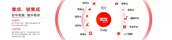 用友提出“集成与被集成”,即主动集成,你中有我、我中有你。用友基于行业客户需求,与行业ISV集成,提供制造业、零售业、服务业、教育业、金融业等行业融合解决方案,助力行业客户数字化升级。