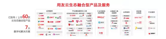 截至2019年8月,用友云市场入驻伙伴已超过4300家,上架产品及服务超过 6800个,发布/上市60款云融合及优选产品,涵盖营销服务、平台基础服务及工具、工业互联网及新零售、大数据工具及服务、业务服务、供应链及物流、行业服务多个领域,并实现7大数字化融合方案,推出5款优选产品。其中,优选产品IoT物联服务深度融合用友制造中台,WMS/TMS、预测营销云深度融入用友营销中台,云招聘及云学习深入融合用友人力云。