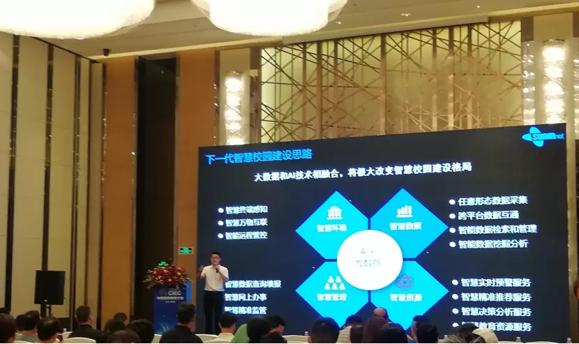 会上,三盟科技大数据产品总监谢长江带来《基于大数据及人工智能技术的下一代智慧校园建设思路》主题报告,提及智慧校园建设,谢长江表示,大数据和AI技术相融合,将极大改变智慧校园建设格局,三盟科技从智慧环境、智慧数据、智慧管理、智慧资源等四个维度出发,将人工智能、物联网、大数据、人脸识别、AR/VR等最新技术融入智慧校园建设,并通过全量数据采集、存储和分析,让教学过程更有趣、更高效,教学更优质,实现最优地教学模式。