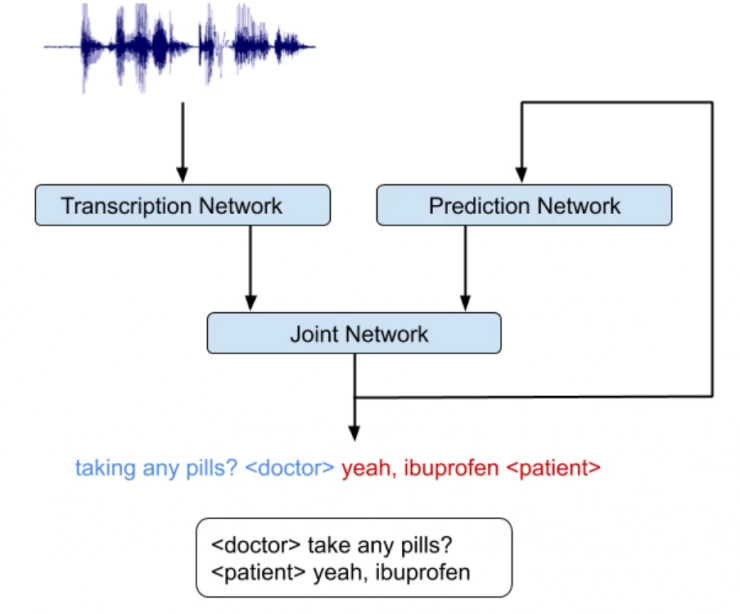 请注意,在下图所示的架构中存在一个反馈循环,其中先前识别出的单词会被作为输入返回给模型,这使得 RNN-T 模型能够引入语言学线索(例如,问题的结尾)。
