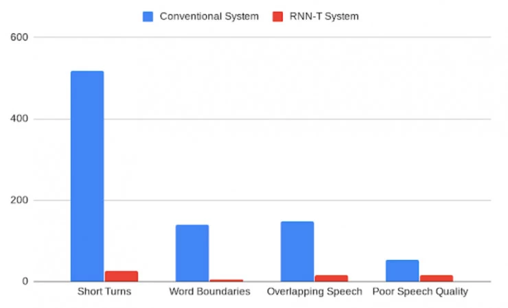 传统系统和 RNN-T 系统错误率的对比,由人类标注者进行分类。
