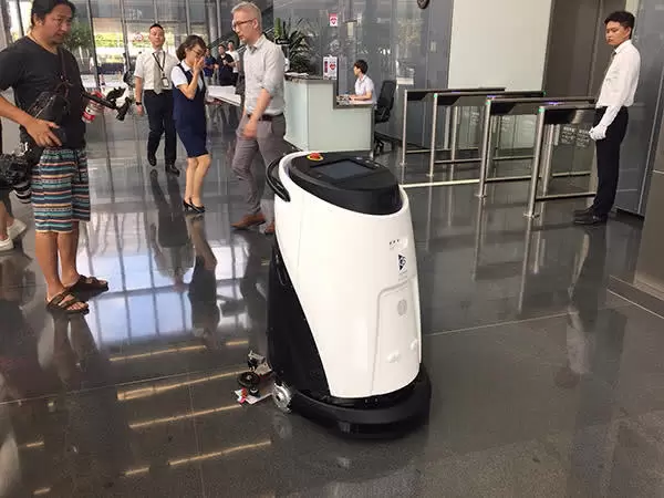 前滩世贸中心二期“智慧楼宇”一楼的清扫机器人正在作业。
