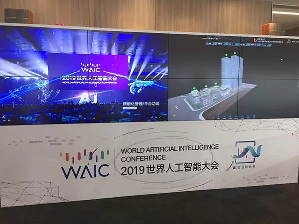 浦东一幢办公楼内的2019世界人工智能大会宣传牌。