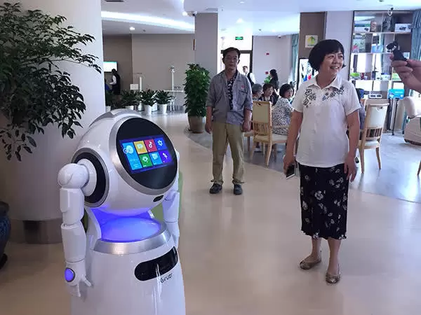周家渡街道社区综合为老服务中心内会跳舞的迎宾机器人。