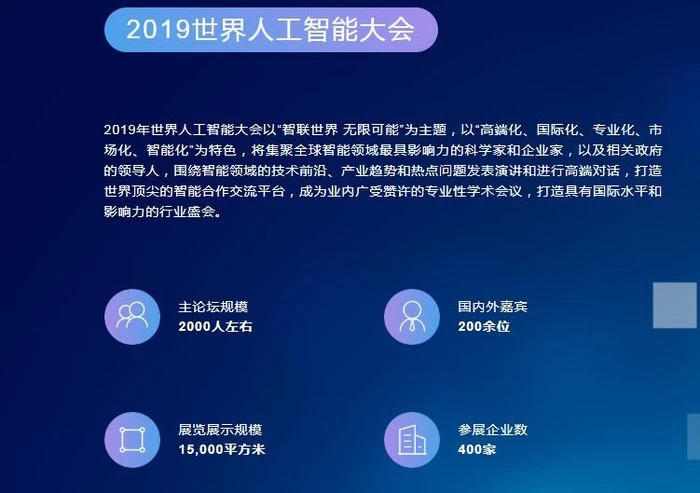 2019 WAIC世界人工智能大会将于8月29日至8月31日举行,此次大会的主题为“智联世界 无限可能”,此次大会展览展示规模15000平方米,主论坛规模2000人左右,邀请到国内外嘉宾200余位,参展企业数400家,可见阵容强大。