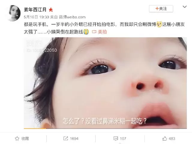 在美国,一位年仅8岁的小女孩伯克希尔的股东大会上因问倒巴菲特而走红,想想8岁的时候你在干吗呢?在中国,也有一位1岁半小朋友的意外之作在网上爆红,微博网友@素年西江月 无意间发现小朋友用自己的美图V6手机拍摄了许多日常生活片段,他惊叹于孩子截然不同的视角和创造力,特地剪辑成了一个一分钟的小视频与网友分享,里面还有小朋友自己拍摄的大片美照。