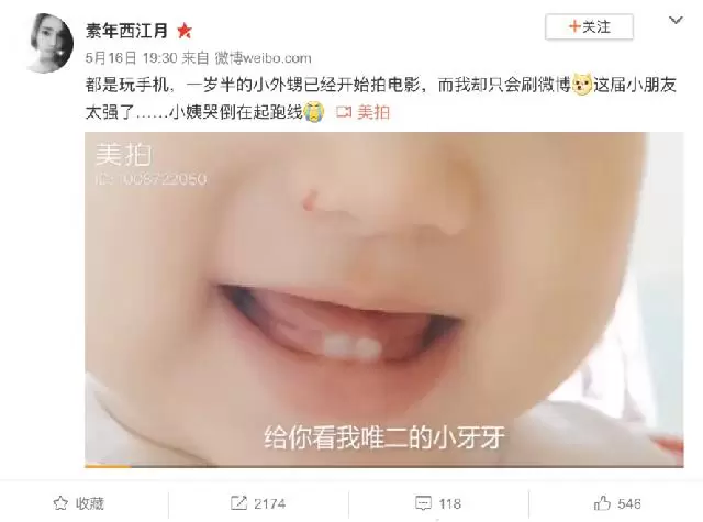 网友@素年西江月 发微博称“都是玩手机,一岁半的小外甥已经开始拍电影了,而我却只会刷微博,这届小朋友太强了……小姨哭倒在起跑线”!