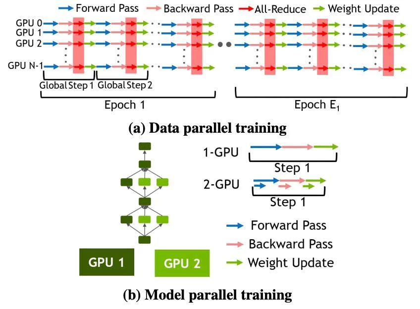 图 2:不同的训练并行化策略,2(a) 展示了数据并行化训练,2(b) 展示了模型并行化训练。