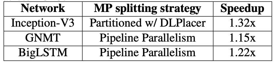 表 1:MP 分割策略和在 2 个 GPU 上实施分割策略时获得的加速。