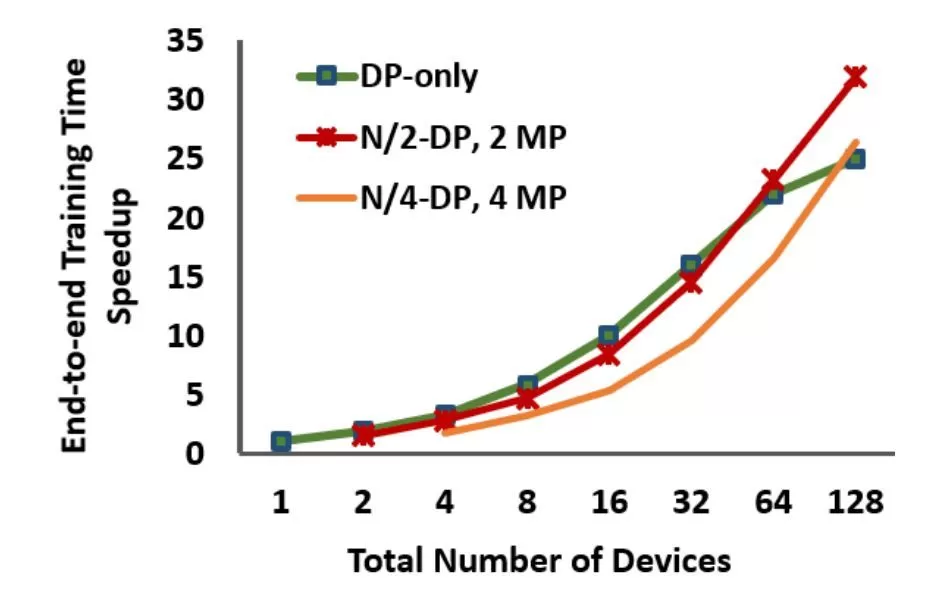 该研究的新颖之处在于,当设备数量(及全局批大小)增长到某个点时(此时 DP 的扩展性能急剧下降),可以将 MP 和 DP 结合起来使用,从而继续改善训练时间。通过 MP 实现的加速在该临界点是非常重要的。该研究表明,每个网络都有一个独特的规模(scale),使得 MP 获取的加速能够解决 DP 的扩展性能和统计效率下降问题。