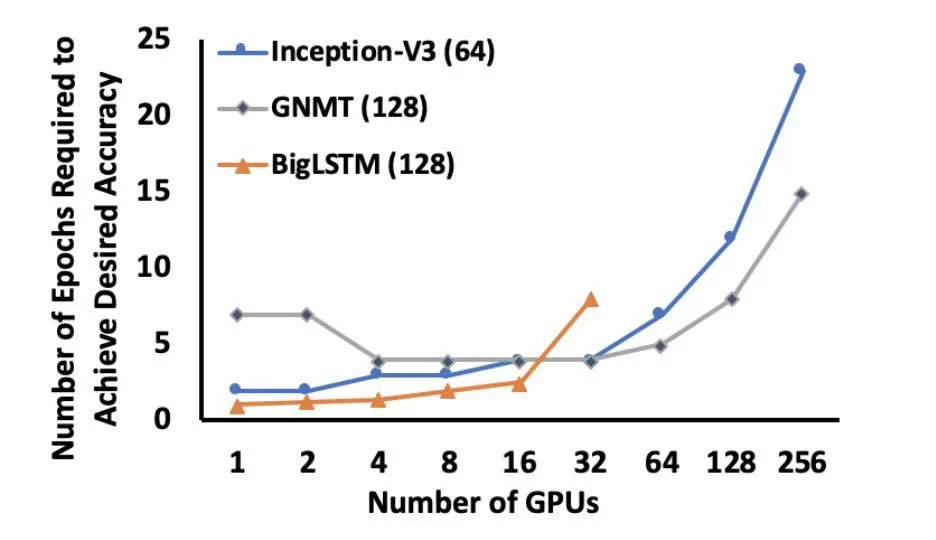 研究者对 Inception-V3、GNMT 和 BigLSTM 模型进行了评估。下图 4 展示了获得预期准确率所需的 epoch 数量与数据并行训练中使用 GPU 数量的关系,epoch 数量通常会随着 GPU 数量的增加(即全局批大小增大)而增长。