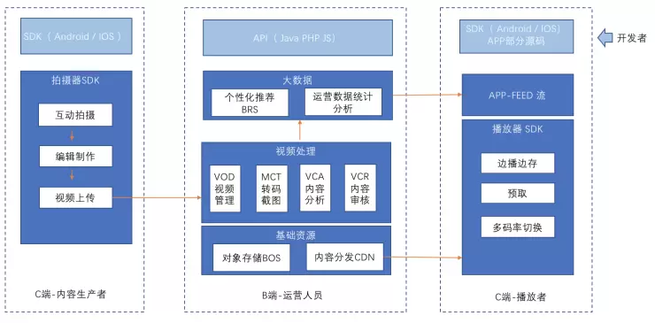 百度智能云构建了智能小视频端到端全链路解决方案,提供了采、编、播、管、存、发等短视频一站式服务,开发者仅需简单几步即可拉起一个短视频APP。在短视频竞争白热化的阶段,让您能更快更高效的上线短视频业务,专注业务运营,赢在起点。