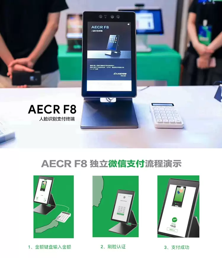 在大会现场,AECR F8不仅可以独立完成微信支付,还与联迪商用智能收银终端AECR C9、AECR C7搭配使用演示了微信人脸支付流程,充分满足各类型人脸支付场景之需。