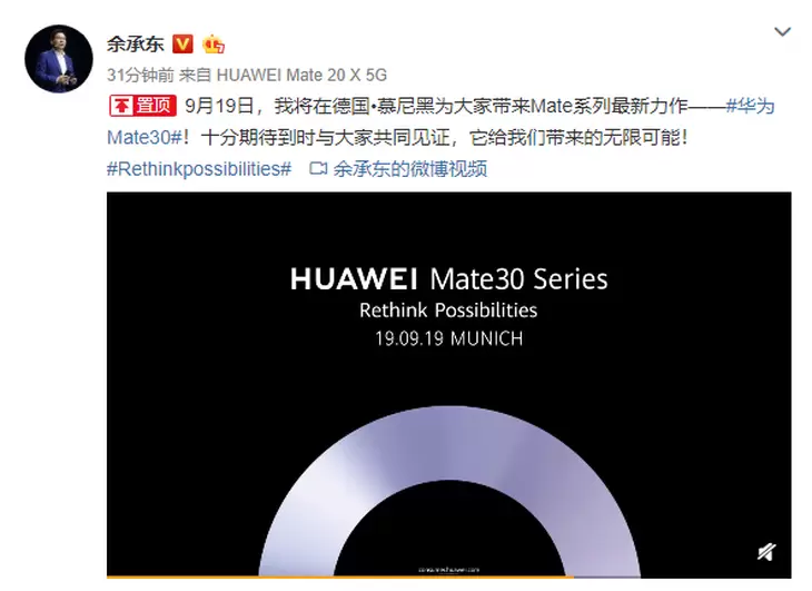 9月1日下午,华为消费者业务CEO余承东在其个人微博,释放了全新预热视频,配以“9月19日,我将在德国•慕尼黑为大家带来Mate系列最新力作——#华为Mate30#!十分期待到时与大家共同见证,它给我们带来的无限可能!#Rethinkpossibilities#”的文案,虽然视频的内容为一个有着银色光泽的金属圆圈,但圆圈上方展示了众多消费者关注的重磅信息,那就是华为Mate30系列即将于2019年9月19日在德国慕尼黑发布。