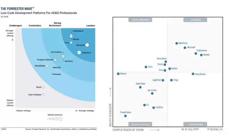 市场研究机构Gartner和Forrester分别绘制了低代码平台的格局版图。