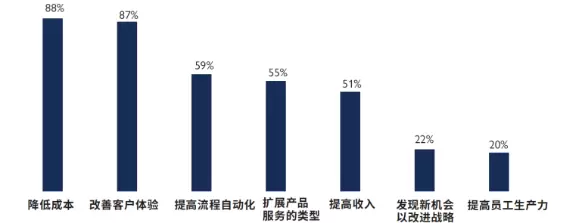 根据IDC与百度AI产业研究中心发布的《百度电脑智能对话引擎白皮书》,企业使用智能对话的预期收益较为明确调研发现,88%的企业认为智能对话能有效帮助企业整体降低运营成本,87%的企业肯定了智能对话在改善客户体验方面的价值,59%的企业表示智能对话在流程自动化方面将发挥较大作用;特别值得注意的是,分别有55%和51%的受访者表示扩展产品和服务类型、提高收入是使用智能对话的预期收益(图3)。可见,企业对使用智能对话的预期收益较高且呈多样化,在降本、增效、创收等方面都希望智能对话给业务带来更大的帮助。