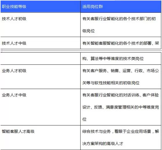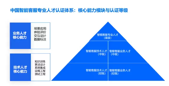 但与智能客服市场快速发展相比,我国人工智能相关人才紧缺度还是非常突显,现存技术人才不能满足爆发增长的产业岗位需求。因此,研究人工智能相关技术人才认证体系变的迫在眉睫。2019年5月27日下午,由百度智能云发起,联合智能客服产业链上下游机构,在京举行专题研讨会,同意成立“中国智能客服专业人才认证标准联盟”,并就联盟定位、运行机制、智能客服专业人才岗位谱系等展开讨论。同时,会上针对智能客服岗位谱系及其“智能客服专业人才认证”体系架构,与会企业、专家根据各自实践经验,取得初步共识,即将智能客服专业人才分为初中高三个层级,其中初级与中级两个层级分为专业人才和技术人才,而在高级人才,考虑到其能力要求的全面性、综合性,将其合并为一个“智能客服专业人才(高级)”。同时,业务人才核心能力界定为场景应用、体验评价、交互设计、数据标注等四个方面,技术人才的核心能力界定为知识训练、算法设计、系统集成、运维工程、测试工程等五个方面。