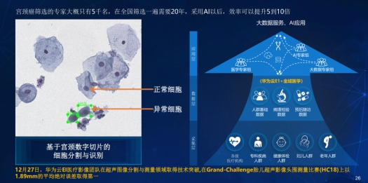 华为云与金域医学合作完成的AI辅助宫颈癌筛查模型,是目前国际已公布的全球AI辅助宫颈癌筛查水平最高的系统,排阴率高于60%,阴性片判读正确率超过99%,阳性病变检出率超过99.9%。通常细胞病理医生判读一例宫颈细胞涂片平均花费6分钟的时间,而AI识别只需要36秒,判读速度比人工整整提高了10倍。在合作过程中,华为云的AI解决方案从标注、训练模型、图片判断、推理等方面为AI模型的训练和应用提供了坚实的基础。