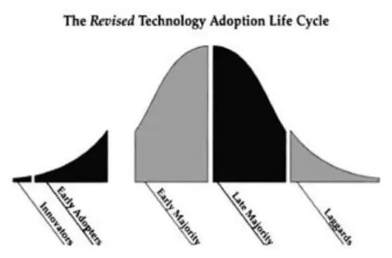 在《跨越鸿沟》这本书中,杰弗里·摩尔认为新技术产品在“早期接纳者”(初期的小范围专业市场)与“早期多数”(中期的非专业大众市场)之间存在着“鸿沟”,顺利跨越“鸿沟”之后,这个产品就会被大众市场接纳进而获得成功。