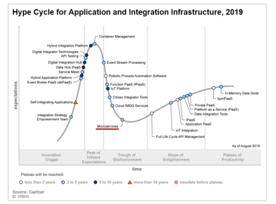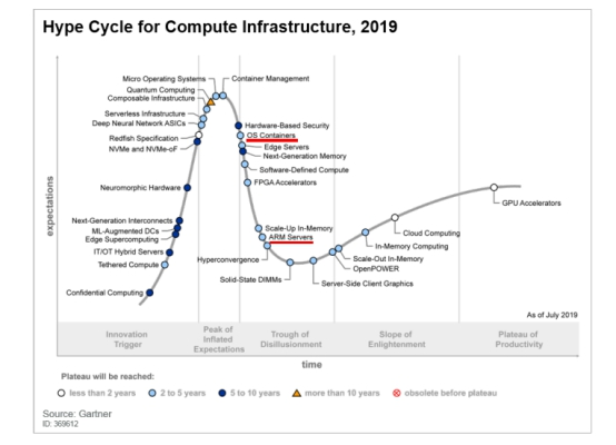 除AI技术,根据Gartner技术成熟度曲线,微服务、ARM服务器、OS Container已经处在泡沫化的谷底期(Through of Disillusionment),经历大浪淘沙之后,这些技术正在迎来拐点,获得越来越多的企业的认真的检验和考量,准备将其应用在生产实践中。