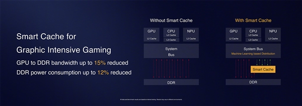 内存存储支持LPDDR4X、UFS 3.0,同时针对高负载游戏应用,重新设计了智能缓存,GPU和内存之间的带宽需求减少了40%,同时内存功耗降低了20%。