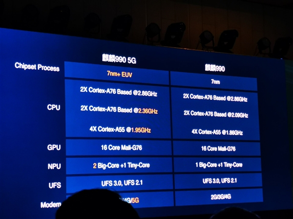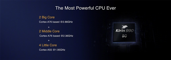 性能方面,麒麟990集成两个基于A76架构魔改的大核心、两个基于A76架构魔改的中核心、四个公版架构的A55小核心,频率麒麟990 5G 2.86GHz+2.36GHz+1.95GHz,麒麟990 2.86GHz+2.09GHz+1.86GHz(中小核略有降低),同时业内首次集成16核心的Mali-G76 GPU。
