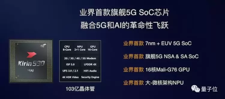 在性能提升的基础上集成5G,最直接的体现就是晶体管数量的大幅度增加:从麒麟980的69亿到了103亿。
