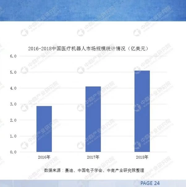 根据中商产业研究院相关数据显示,我国医疗机器人应用效果良好,不断渗透,初步估计2018年市场规模达到5.1亿美元。