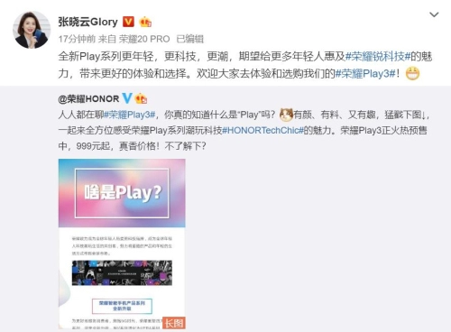 9月11日,荣耀HONOR官方微博发布长文,梳理解读了荣耀全新的产品系列——荣耀Play系列。荣耀战略和品牌发展张晓云也转发此微博,表明“全新Play系列更年轻、更科技、更潮,期望给更多年轻人惠及#荣耀锐科技#的魅力,带来更好的体验和选择”。早在9月4日,荣耀在武汉举办了新品发布会。发布会不仅推出了荣耀20S和荣耀Play3等新产品,还公布了荣耀全新的产品系列和定位。荣耀希望通过鲜明而又充满自身个性的产品系列划分,让所有荣耀产品能够凝聚成更潮更完整的产品形象,进一步和年轻用户沟通,让他们畅想科技的快乐。