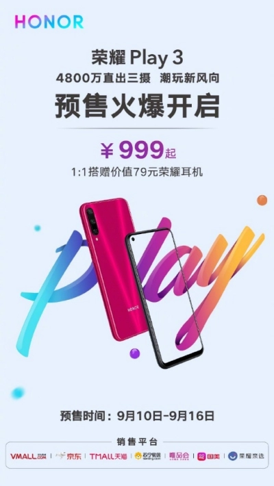 荣耀Play3已于9月10日在华为商城Vmall、京东、苏宁易购、天猫等平台正式开启预售,此次预售的配色为魅焰红和幻夜黑。正式开售会在9月17日。荣耀Play3的4GB+64GB版本 售价999元,4GB+128GB 、6GB+64GB版本售价均为1299元。作为对广大消费者的福利,预定期间下单还会获赠价值79元的荣耀耳机一副。