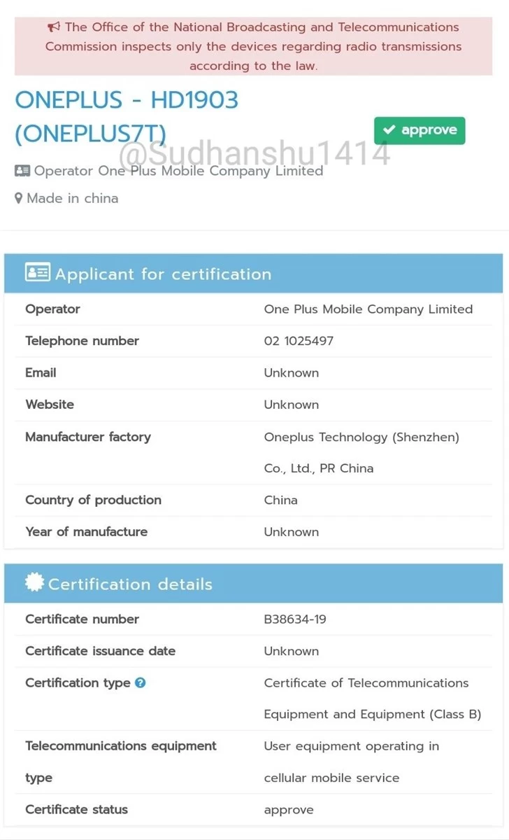 据推特网友Sudhanshu1414消息,发现一加7T(型号为HD1903)手机通过NBTC认证,这也表明这款新手机将很快上市。