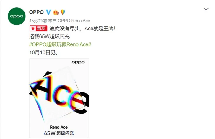 OPPO Reno Ace发布时间敲定:10月10日,配65W超级闪充