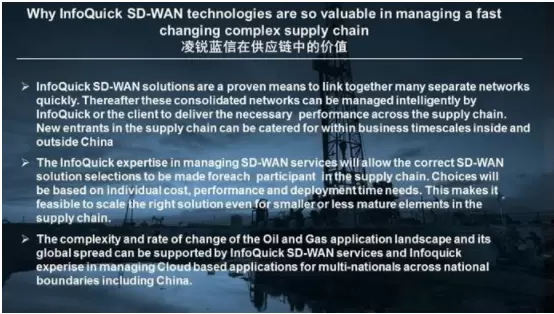 Mr. Brian演讲的主题为《InfoQuick SD-WAN Solutions in Support of Oil and Gas Facilities Engineering》的演讲,为到场的与会嘉宾分享了全球石油天然气工程的数字化发展,数字孪生与全球供应链,前沿工程技术与数据管理以及凌锐蓝信在其中发挥的重要价值。