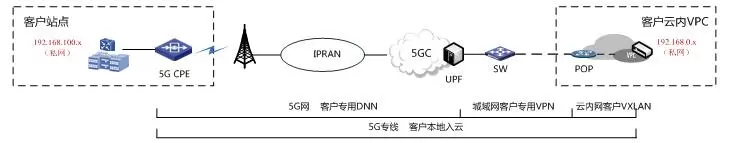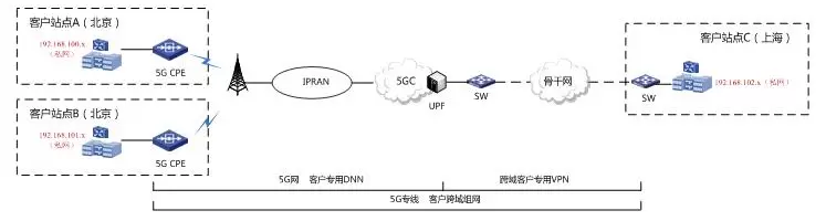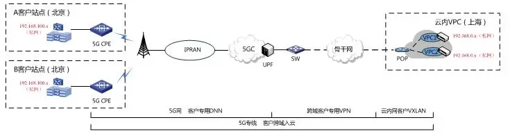 客户北京站点通过5G CPE Pro接入5G网络,以客户专用DNN进行隔离,在5G核心网进行入云流量识别与分流,送入城域网客户专用VPN完成入云。