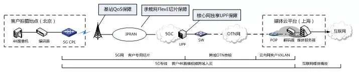 测试场景中,为4K直播回传业务配置专用100M端到端切片保障,包括基站QoS、承载网FlexE切片、核心网独享切片、5G外网独享传输资源。北京4K摄像机和编码器接入5G CPE Pro,通过有切片保障的5G专线将直播视频流传回上海媒体云平台,由媒体平台面向互联网提供视频服务。