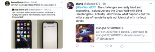 更令挑战者欲罢不能的是,2019RealWorldCTF线上赛与真实世界充分接轨。比赛首日,即放出包括“iOS应用破解”和“GoogleChrome”在内的两枚“重磅炸弹”。区别于其他同类赛事使用虚拟环境和替代环境的赛题设置,此次RealWorldCTF将挑战环境平移至真实的iPhoneXR(12.4.1)系统之上,让选手们在挑战的同时,更融入真实软件操作的代入感,将“HacktheReal”进行到底,受到了参赛队伍的一致好评。