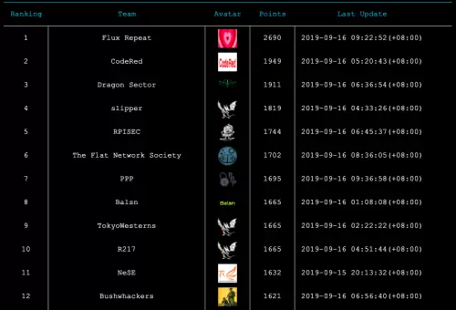 近日,网络安全行业一场王者之争已拉开序幕。9月14日,由全球顶尖的网络信息安全公司长亭科技主办的2019RealWorldCTF线上赛经过为期两天,整整48小时不间断的激烈角逐,9月16日,12强进入决赛战队终于新鲜出炉。决赛战队将于12月集结北京线下赛一决高下。