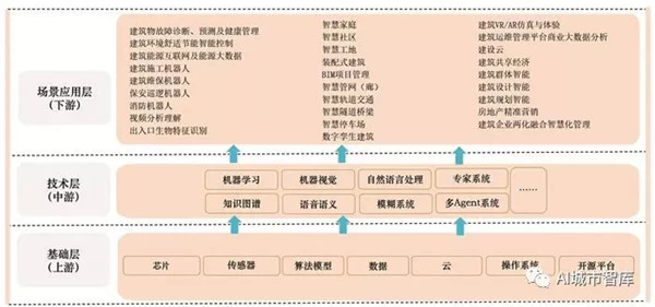 “AI+智慧建筑”产业链模型由基础层(产业链上游)、技术层(产业链中游)、场景应用层(产业链下游)组成,每一层对上一层及具有支撑意义。在场景应用层,包含了智慧建筑领域丰富的应用场景,这些“场景+AI”共同构筑了AI+智慧建筑的全景图。