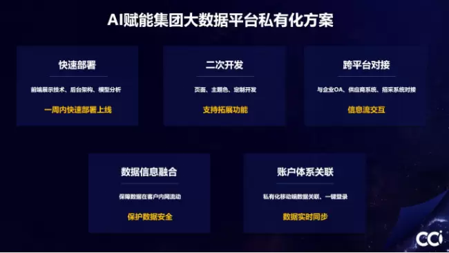 本次获奖的集团供应链大数据管理平台在满足企业数据处理需求的基础上,为客户量身定制从需求生产到应用场景的完整私有化解决方案,包括:可快速进行系统部署、可二次开发无限扩展功能、私有化部署的系统与集团公司的内部系统打通、数据在集团企业内网交互融合、企业账号体系互相关联等。