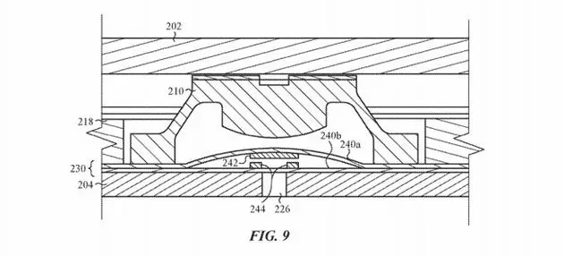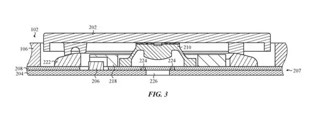 在苹果提交的文件中,该公司建议使用一块直接粘贴在印刷电路板(PCB)上的薄膜。开关外壳可以选择性地直接固定在薄膜或PCB上,圆顶开关直接耦合在薄膜顶部。通常,薄膜不附着在PCB上,而是用于帮助简化连接,从而触发按键。通过将膜完全附着在PCB上,可以消除空间浪费,并使各个组件靠得更近。