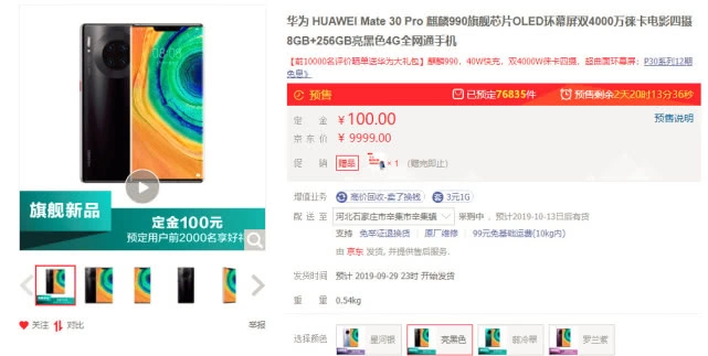 虽然华为Mate30系列尚未在国内正式开售,但各大电商平台已经全面开始100元订金预售,截止到9月23日18点,京东华为官方旗舰店的华为Mate30 Pro的预定量已经超过7万台。在天猫华为官方旗舰店华为Mate30系列的预售成绩也创下新高,目前华为Mate30 Pro的预订人数达到4万台。