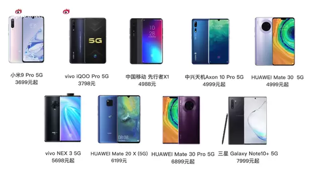iPhone11系列没有5G,而华为Mate 30系列、小米9 Pro、vivo NEX 3、三星Galaxy Note10+等手机则都有5G版本。