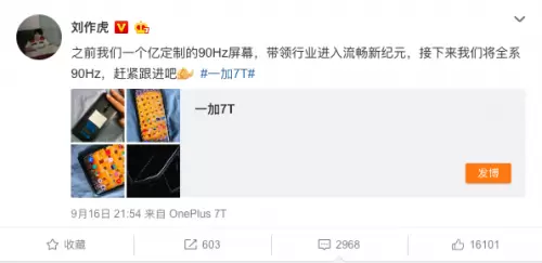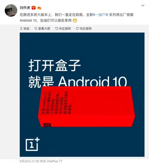 早在上个月,一加科技CEO刘作虎就已经在微博上晒出了“OnePlus 7T”的小尾巴,同时也透露了不少关于一加7T的产品信息。刘作虎表示,一加7T也将采用90Hz刷新率的屏幕,接下来一加将全系90Hz。此前,一加7 Pro的90Hz流体屏凭借着流畅跟手的体验而广受全球媒体和用户的好评,这一次,一加将流畅顺滑的屏幕体验带到了更多的产品上。这也意味着,一加成为手机行业中第一家全系手机切换90Hz刷新率的厂商。