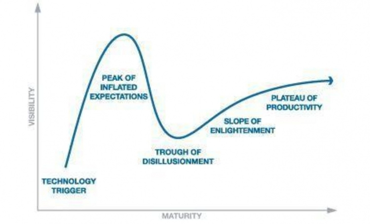 如果说我们把5G看成一种新兴的技术,那么新兴技术的发展一般都会呈现加德纳曲线效应,即技术的发展一般会经过五个阶段:技术萌芽期,期望膨胀期,幻觉破灭期,复苏期与平稳生产期。