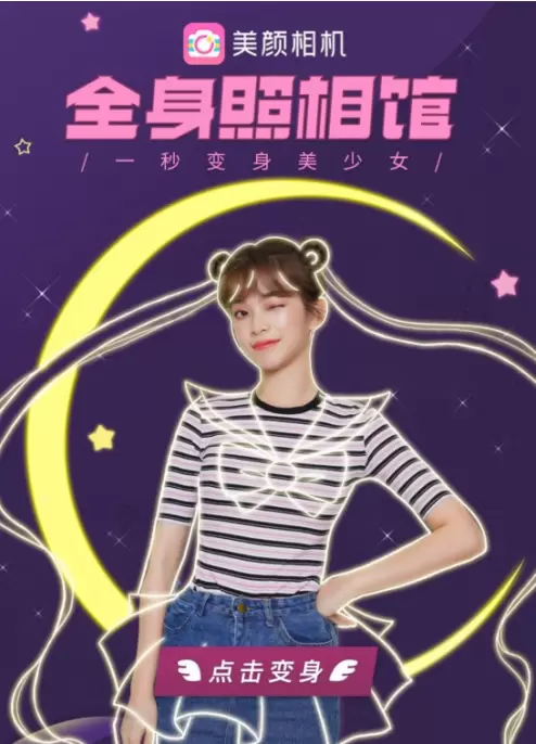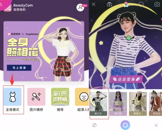 想体验Angelababy同款特效的“美少女们”,快打开美颜相机点击全身照相馆选择美少女模板吧,一秒变身美少女本尊哟!