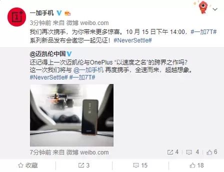 2019年10月9日,一加手机正式宣布与迈凯伦再度联手,双方将基于追求速度、卓越与创新的共同理念,展开一系列深度合作。