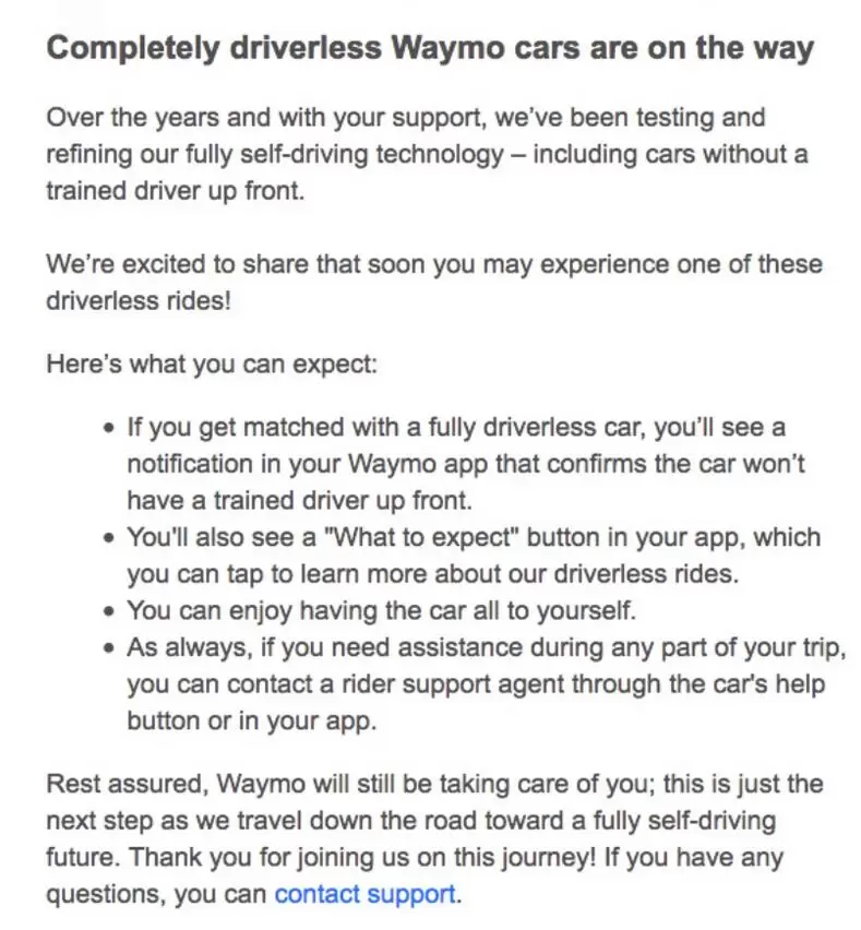 无法联系Waymo进行评论。 TechCrunch能够确认电子邮件已发送给Waymo的早期骑手计划的成员。该电子邮件在下面发布。