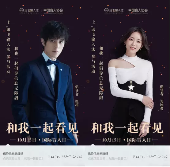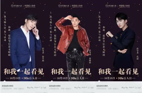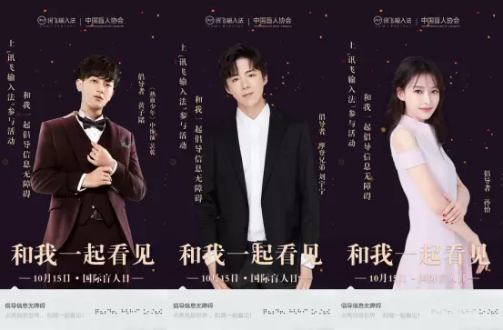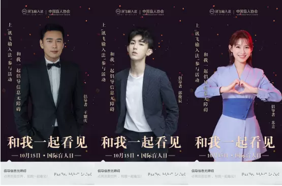 今年10月15日是第三十六个国际盲人节。在这样的日子,讯飞输入法联合中国盲人协会发起#和我一起看见#的公益行动,携手黄子韬、摩登兄弟(刘宇宁)、孙怡、王耀庆、郭俊辰、苏青、徐开骋、黄维德、刘泳希、代超、张超等十多位明星一起倡导信息无障碍。通过讯飞输入法智能语音和无障碍输入帮助弱势群体跨越沟通鸿沟,提升品质生活。